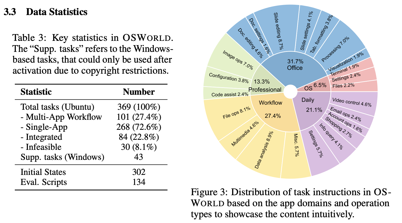 我们介绍了OSWORLD基准测试,它包括在Ubuntu上定义和执行的369个真实计算任务。此外,我们还提供了一个基于OSWORLD环境的Windows任务集合。环境准备、注释过程、数据统计和人类表现将在本节中进行描述。