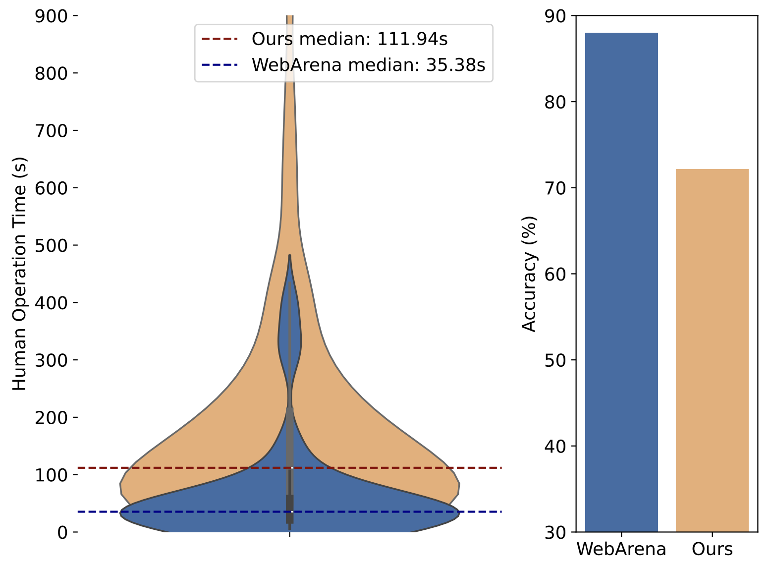 任务难度 我们根据人类完成所需的时间将任务分为三组:0∼60秒(简单)、60秒∼180秒(中等)和大于180秒(困难),作为难度的指标。在这些组中,随着所需时间的增加,模型的成功率下降,所需时间超过180秒的任务几乎不可能完成(考虑到我们有不可行的示例供代理人员使用),而人类在这三组任务中的表现分别为84.91%、81.08%和49.57%,显示出相同趋势的轻微下降,但不至于无法实现。