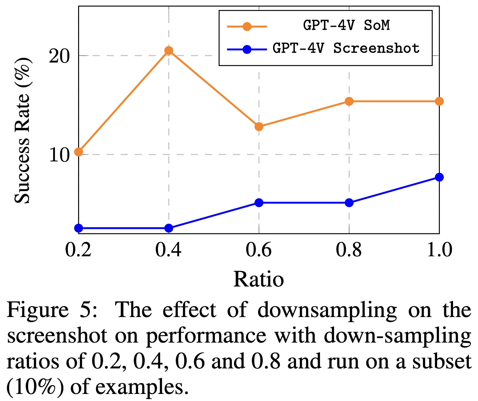 更高的截图分辨率通常会导致性能提高 尽管显示技术取得了显著进展(1080P、2K和4K),但大多数VLM仍然是在远低于这些分辨率的数据上进行训练的。我们选择纯截图输入和SoM设置来测试该方法在不同屏幕输入降采样比例(即原始分辨率的0.2、0.4、0.6和0.8)下的性能,以评估分辨率变化对模型识别能力和准确性的影响。截图设置的模型输出坐标仍然预期与原始分辨率(即1080P)对齐。图5显示了不同输入分辨率对性能的影响。对于基于纯截图的输入,观察到分辨率的增加直接与性能的提高相关。这个问题可能源于截图的分辨率与输出坐标之间的差异。然而,SoM的情况略有不同。有趣的是,将分辨率降低到768×432(降采样比例为0.4)会导致代理的性能提高,进一步将分辨率降低到0.2的降采样比例会导致性能明显下降。