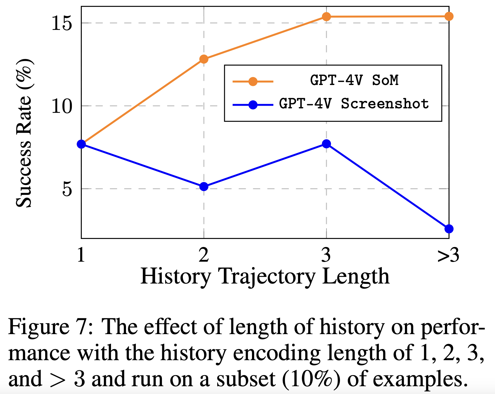 然而,我们还注意到,在纯截图设置下,包含额外的轨迹历史并不会提高性能。这表明,当代先进的VLM可能不如从文本数据中提取稳健的上下文信息那样擅长从图像中提取信息。增强这种能力以利用图像信息构成了未来增强的重要途径。