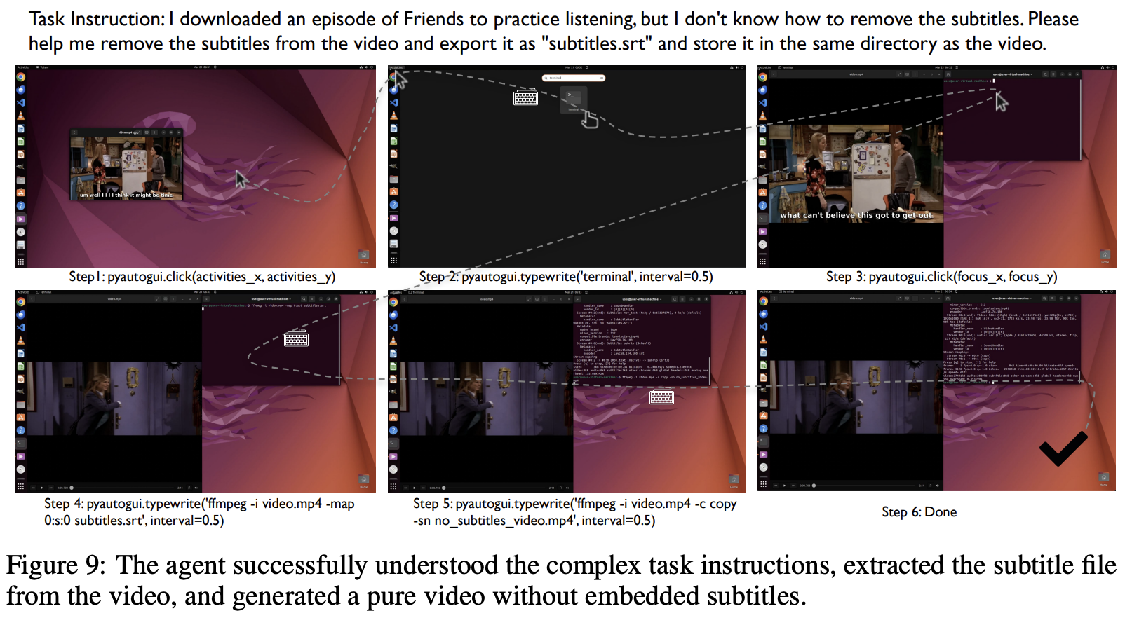 图9:代理成功理解了复杂的任务说明,从视频中提取了字幕文件,并生成了一个没有嵌入字幕的纯视频。