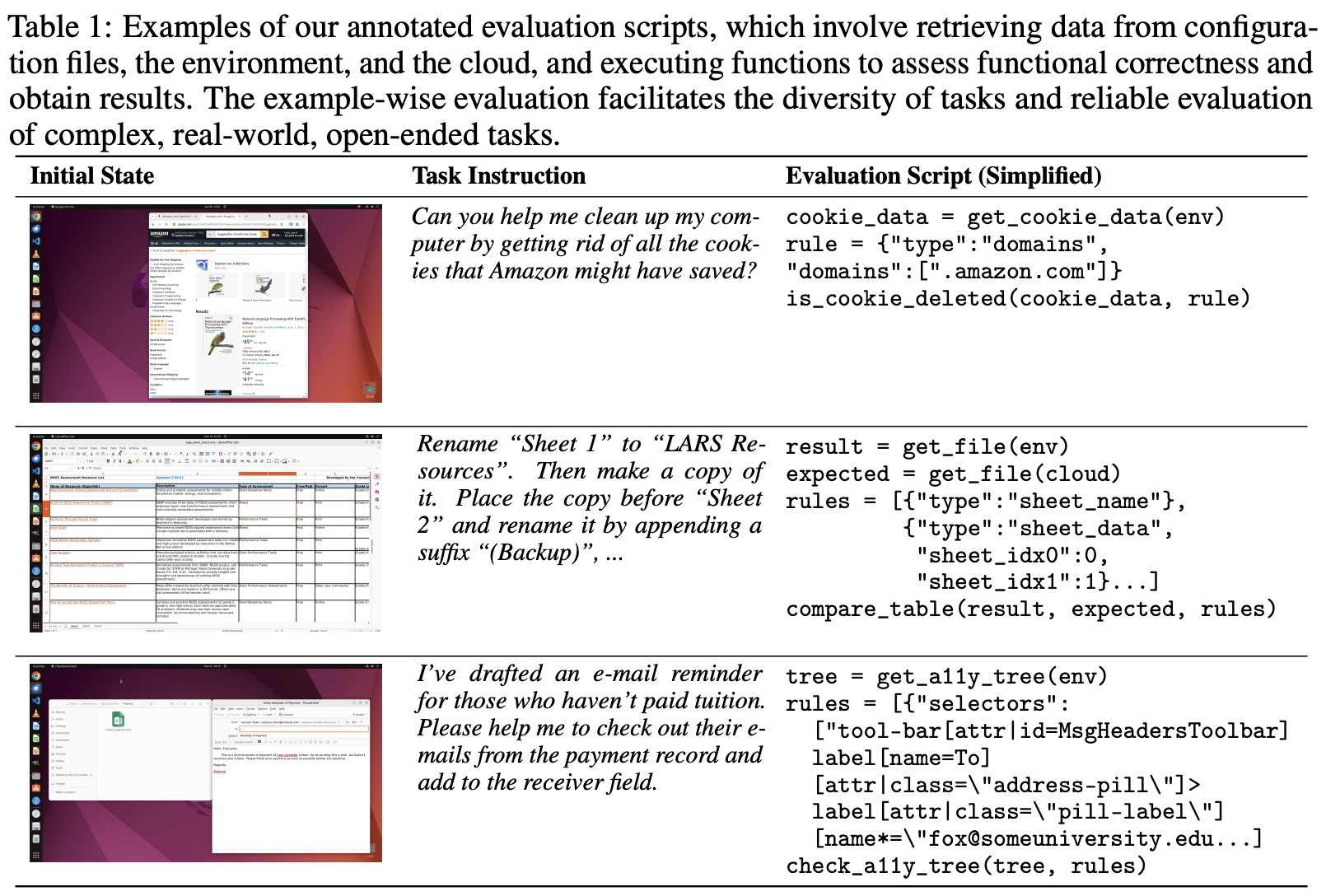 因此,我们构建了一个庞大的函数集合,用于最终整理和从云和虚拟机中的软件中检索各种类型、类别和粒度的文件和数据信息,以及涵盖不同方面及其组合的评估函数,将这些信息作为参数输入以评估结果。我们在表1中展示了一些评估示例。演示了从虚拟机中检索cookie数据,从虚拟机和云服务中获取文件,从虚拟机中获取当前运行时界面的可访问性树,并根据这些信息确定Amazon的cookie是否已删除,生成的表是否准确,以及是否已访问正确的界面。需要注意的是,当任务的类型具有实时特性(例如某人论文的引用次数、博客的内容等)时,我们在getter中包含动态函数(例如爬虫脚本),以在评估时刻获取实时值,然后将其与代理在任务完成时获得的结果进行比较。更多内容请参见附录B.6。