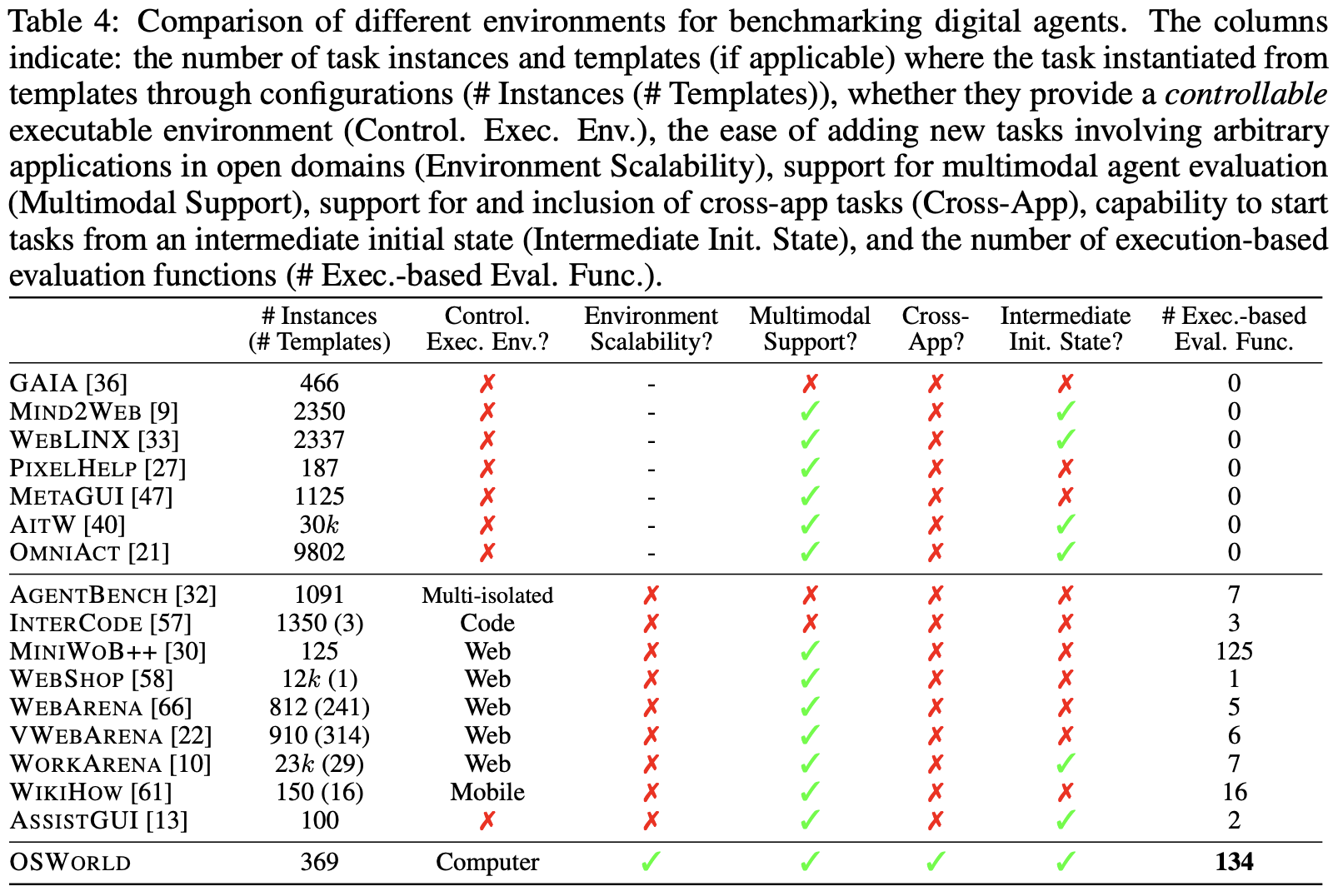 Benchmarks for multimodal agents Testing digital interaction agents mainly spans coding environments, web scenarios, and mobile applications. In the coding domain, several works provide frameworks and datasets for evaluating agents across programming languages and software engineering activities [57, 20, 24, 45]. For web browsing, platforms have been developed for agents to interact with web interfaces through keyboard and mouse actions, alongside datasets focusing on open-ended web tasks and realistic web navigation [44, 30, 58, 9, 66, 22, 10]. Mobile device interaction research aims at improving accessibility, with simulators for mobile UI interactions and platforms dedicated to InfoUI tasks [27, 47, 51, 50, 40, 61, 53, 60, 52]. Further, environments connecting to real computers and datasets for GUI grounding, albeit without interactive capability, have emerged [13, 8, 38, 21, 48]. Comprehensive task evaluation across different aspects also sees innovations [32, 36]. Differing from previous endeavors focusing on singular environments or lacking executability, OSWORLD integrates an interactive setup enabling agents to engage with operating systems openly, supported by a diverse array of tasks and precise evaluation scripts within a fully controllable setting, marking it as a competitive benchmarking realism and reliability, as well as an environment for learning and evaluating general-purpose digital agent (See Tab. 4 for comparison).