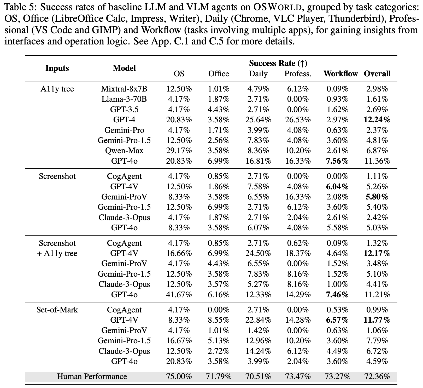 We extensively evaluate state-of-the-art LLM and VLM-based agent baselines, including the GPT-4V series [39], the Gemini series [49, 41], the Claude-3 Opus [3] and the Qwen-Max [5], as well as Mixtral [19], Llama-3 [35] and CogAgent [17] from the open-source community. The performance of these experiments ranges from 0.99% to 12.24%, with subsets of applications even reaching 0%, for workflow tasks that involve cooperation from multiple apps, the highest performance of the baseline agent is only 6.57%. This indicates that current LLMs and VLMs are far from capable of serving as computer assistants (§4.2). Results also show that while additional knowledge such as the accessibility tree and Set-of-Mark (§4.1) can be helpful, it can also lead to potential misguidance and varies across models. We also observe performance changes in these agents compared to consistent human performance across different types of computer tasks. Analysis reveals that VLM-based agents struggle to ground on screenshots to predict precise coordinates for actions, tend to predict repetitive actions, are unable to handle noise from unexpected application windows and exhibit limited knowledge of basic GUI interactions and domain-specific features of apps (§5.2, §5.4). Feeding higher resolution and more trajectory history can help improve the performance by even doubling while requiring longer context length and efficient modeling (§5.2). We open-source OSWORLD environment and benchmark, including environment initial state setup, reliable evaluation scripts, documentation, and our implementation of baseline models to promote research towards the goal of generalist capable computer agents 1 . Future work can focus on enhancing VLM GUI grounding abilities, including interaction commonsense knowledge, higher-resolution support, and coordinates accuracy for more robust GUI interactions. Additionally, efforts can be made to improve agent architectures to better handle complex computer tasks through exploration, memory, and reflection.