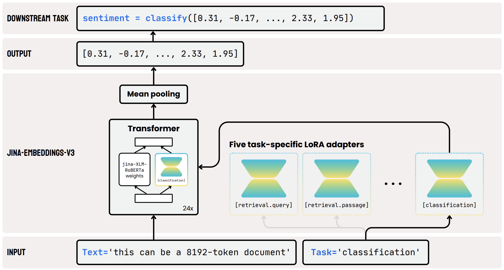 jina-embeddings-v3 的架构基于 XLM-RoBERTa 模型,并进行了几项关键修改。集成了 FlashAttention 2 以提高计算效率,同时 RoPE 扩展了对最长 8192 个 token 序列的支持。引入了任务特定的 LoRA 适配器,以优化各种任务的 embeddings。模型的输入由两部分组成:文本,即要嵌入的长文档,以及任务类型。jina-embeddings-v3 支持四种任务,并实现了五种适配器可供选择:retrieval.query 和 retrieval.passage 用于非对称检索任务中的查询和段落嵌入,separation 用于聚类和重新排序任务,classification 用于分类任务,text-matching 用于涉及语义相似性的任务,如 STS 或对称检索。