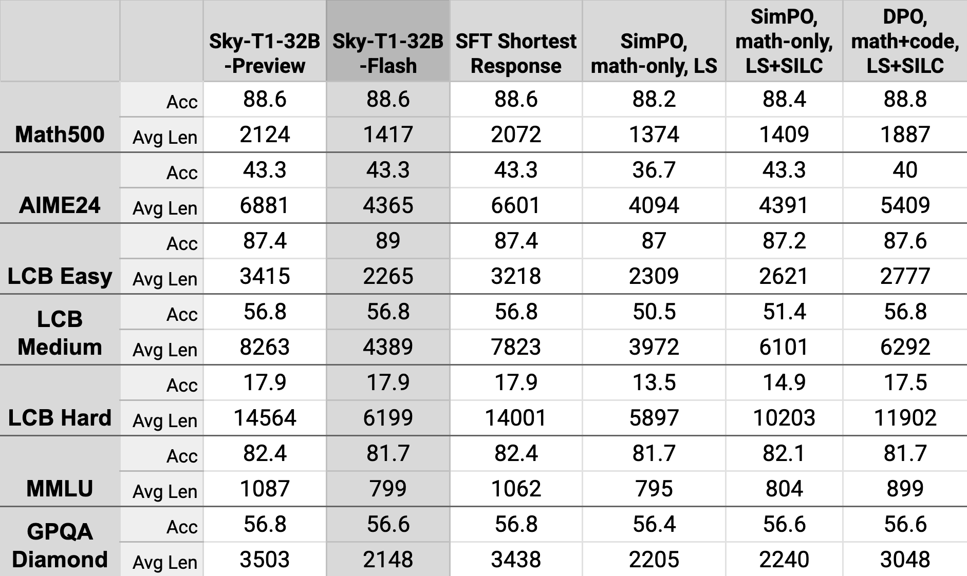 在多个基准测试(MATH500、GPQA、MMLU)上,偏好优化减少了生成长度并基本维持了准确性。然而,我们观察到在编程的具有挑战性的问题(LiveCodeBench-Medium 和 -Hard)和最具挑战性的数学套件(AIME24 和 MATH500 Level 5)上准确性有所下降。这些结果表明,模型在需要更复杂推理的情况下思考不足。为了解决这个问题,我们使用初始的每个问题 8 个回答的数据集,向我们的训练数据中添加了 1K 个偏好对,其中负样本是最短的错误回答,正样本是长于负样本的最短正确回答,确保模型在必要时保持深度推理的能力。这种新的数据混合使模型在最具挑战性的数学基准测试上恢复到与 Sky-T1-32B-Preview 相当的水平。
