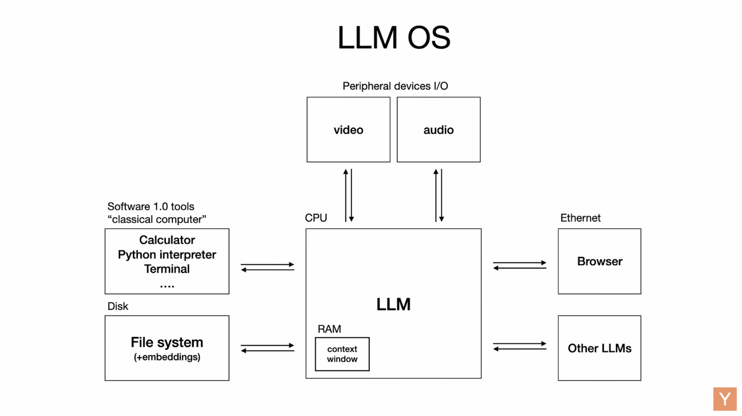 - CPU:在这里被LLM取代,或者说LLM扮演了传统CPU的角色,作为系统的核心处理单元。