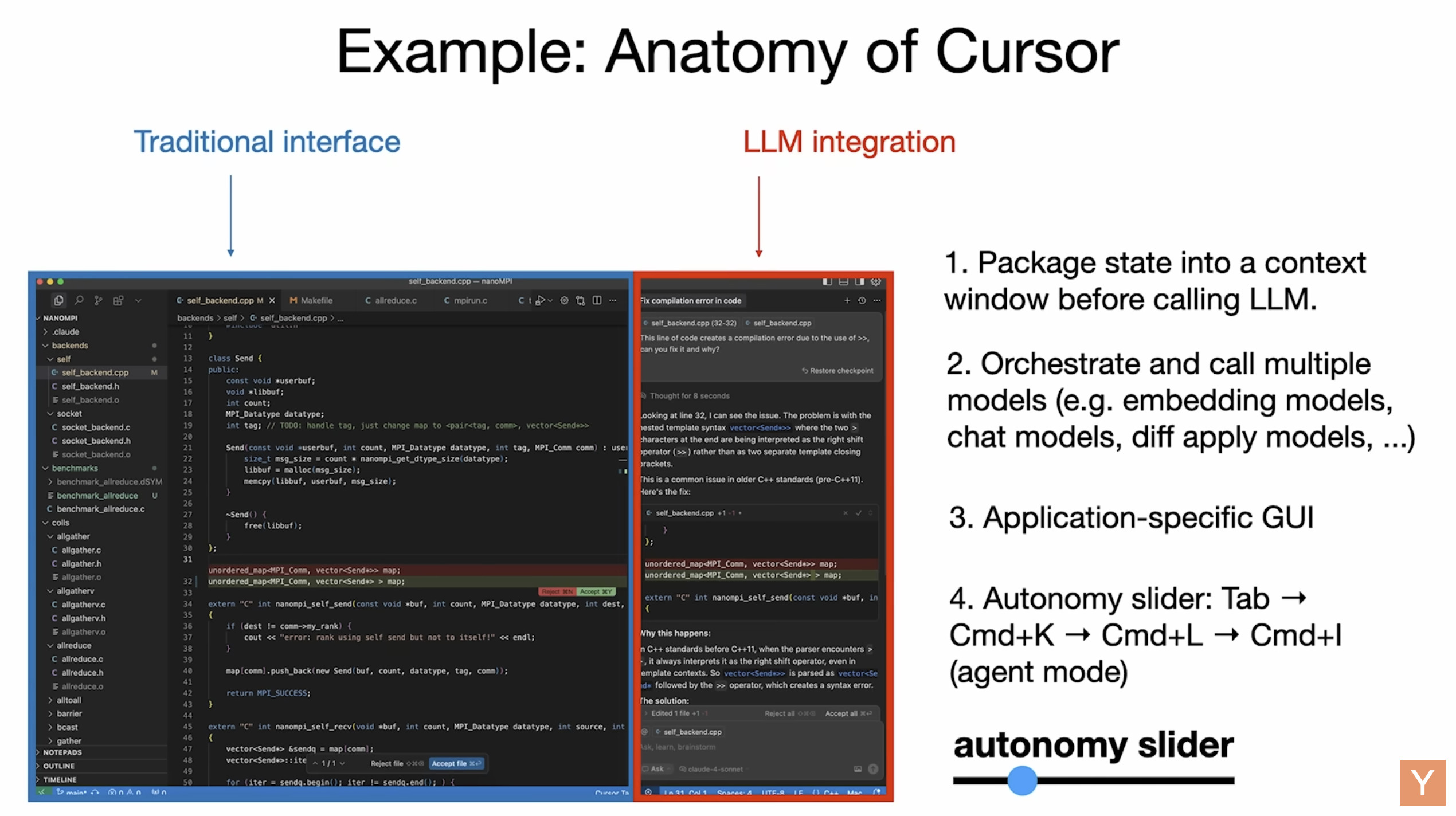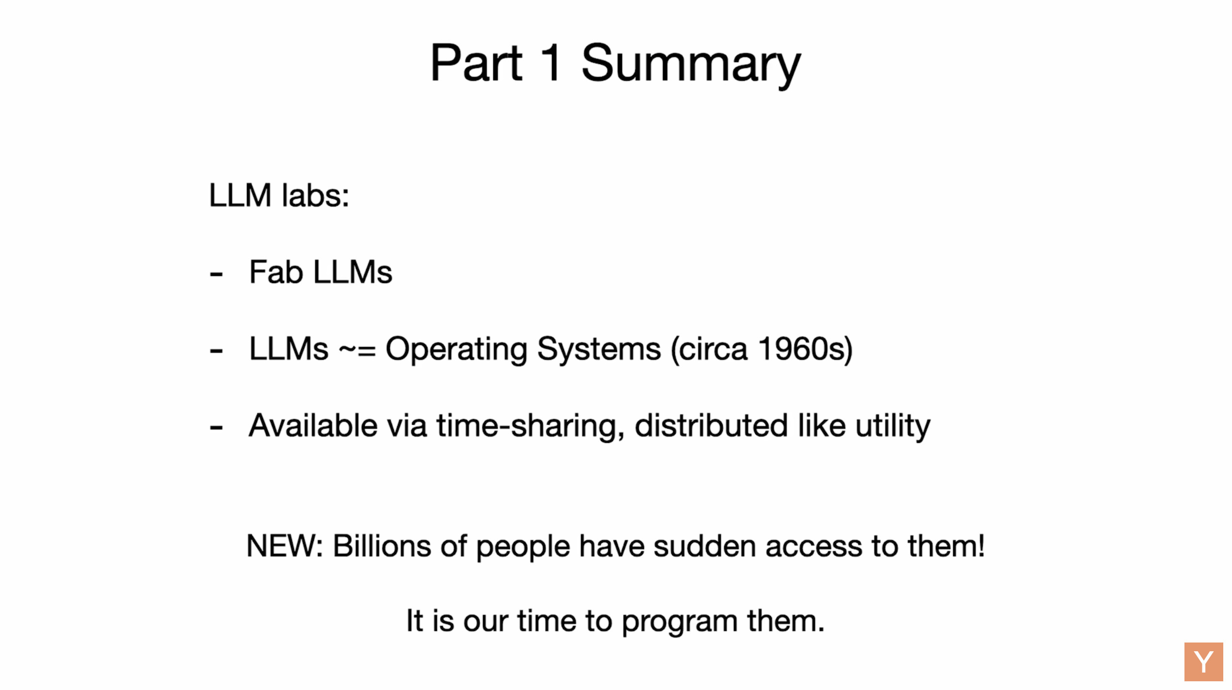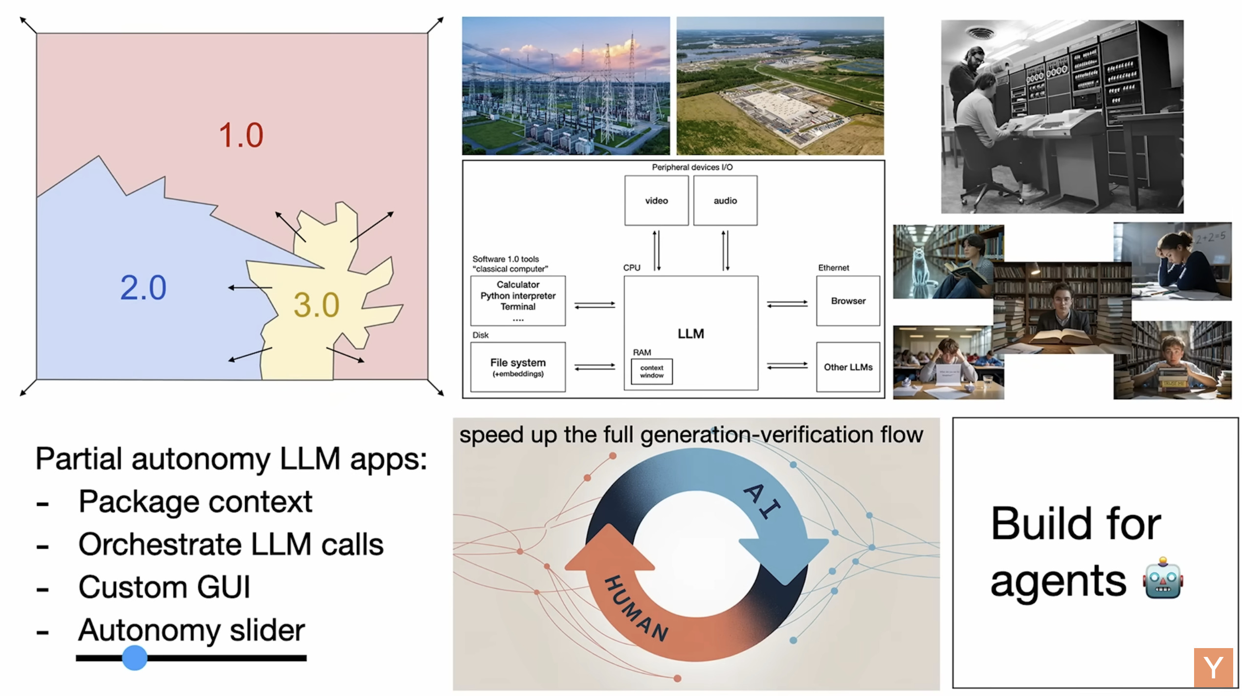 主要介绍了软件开发领域正在经历的重大变革,将其分为软件1.0(传统手工编码)、软件2.0(基于神经网络权重训练)和软件3.0(通过自然语言提示编程大型语言模型)。演讲者将大型语言模型(LLMs)比作新型操作系统和基础设施,指出它们既具备公用事业的性质(按量付费、集中式),也展现出类似芯片制造厂和操作系统的特征,且目前仍处于早期阶段(类似于1960年代的计算)。进一步探讨了LLMs的认知特性(如广博知识、幻觉、记忆局限),并强调了开发部分自主应用的重要性,这些应用能让人类通过图形用户界面和自主性滑块有效监督AI。最后,演讲者提出,随着自然语言编程的兴起,人人皆可编程,并呼吁开发者为智能体优化数字基础设施和文档,预示着一个由人类与AI协作构建的 “钢铁侠战衣”式未来。