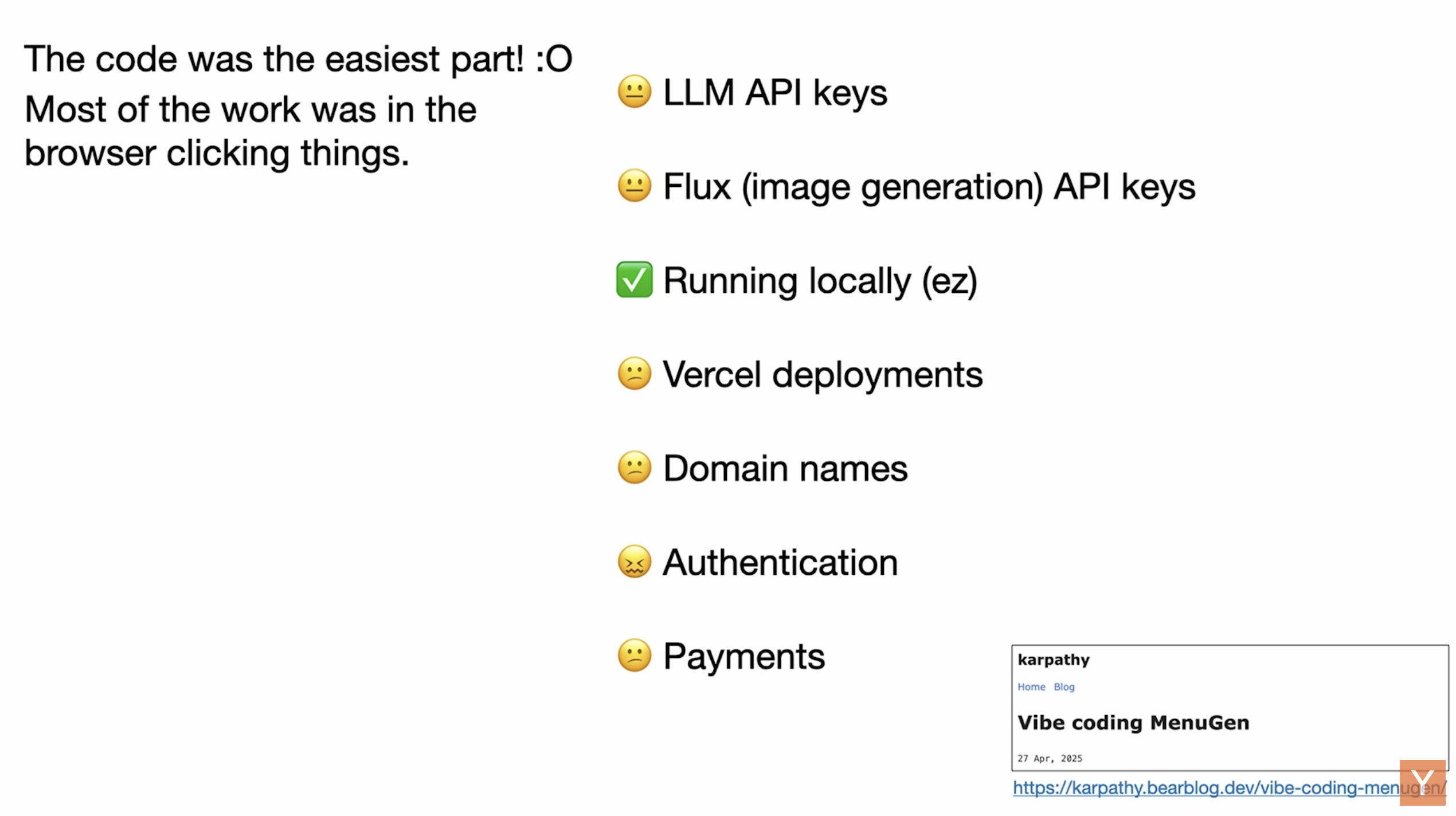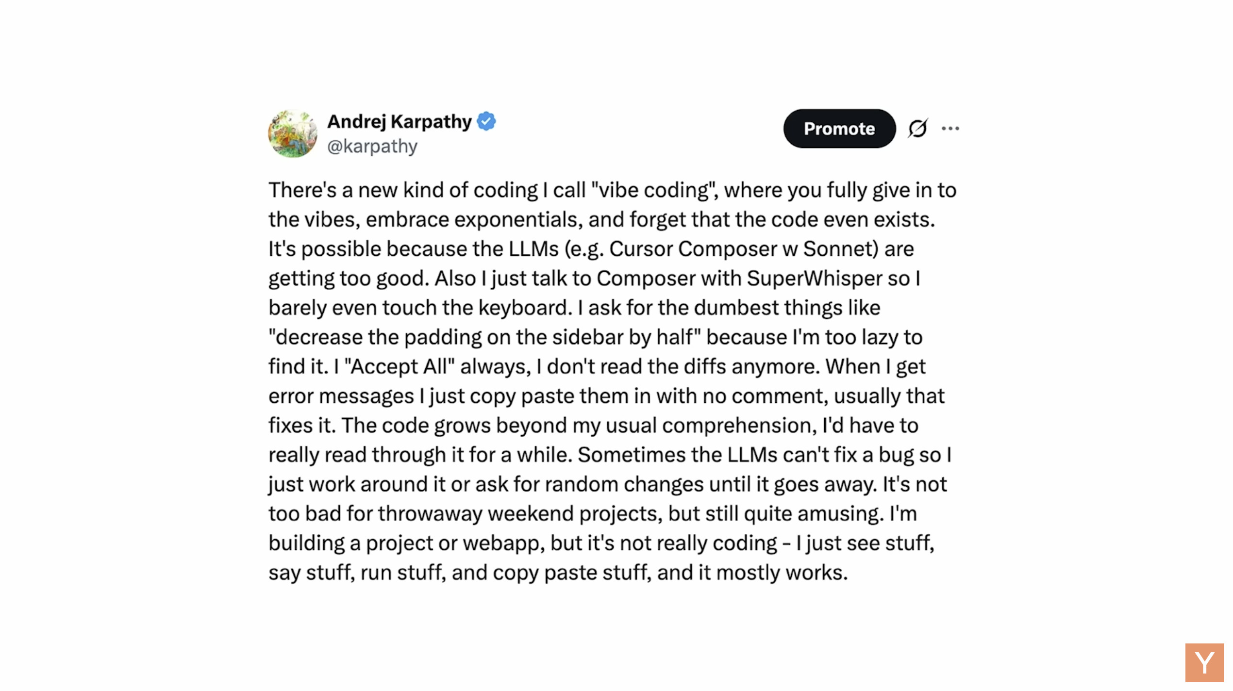 有一种新的编码方式我称之为“氛围编码”(vibe coding),你完全沉浸在氛围中,拥抱指数级增长,并且忘记了代码的存在。这之所以可能,是因为大型语言模型(LLM)(例如 Cursor Composer w Sonnet)变得太好了。我还与 Composer 使用 SuperWhisper 对话,所以我几乎都不碰键盘。我问一些最蠢的事情,比如“将侧边栏的填充减少一半”,因为我懒得找它。我总是“接受所有”,我不再阅读差异。当我收到错误消息时,我只是复制粘贴它们,不加评论,通常就能解决。代码的增长超出了我通常的理解范围,我需要真正阅读一段时间。有时 LLM 无法修复 bug,所以我只是绕开它,或者要求随机更改,直到它消失。这对于一次性项目来说还不错,但仍然相当有趣。我正在构建一个项目或网络应用,但这并不是真正的编码——我只是看东西,说东西,运行东西,复制粘贴东西,而且它大部分都能工作。