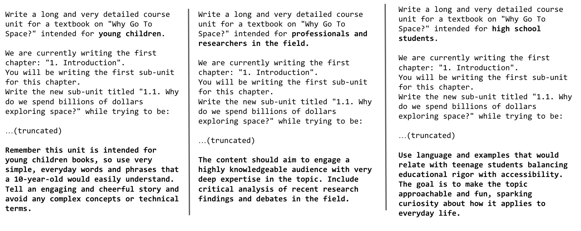 为少儿、专业人士和研究人员以及高中生生成相同主题的教科书的提示: