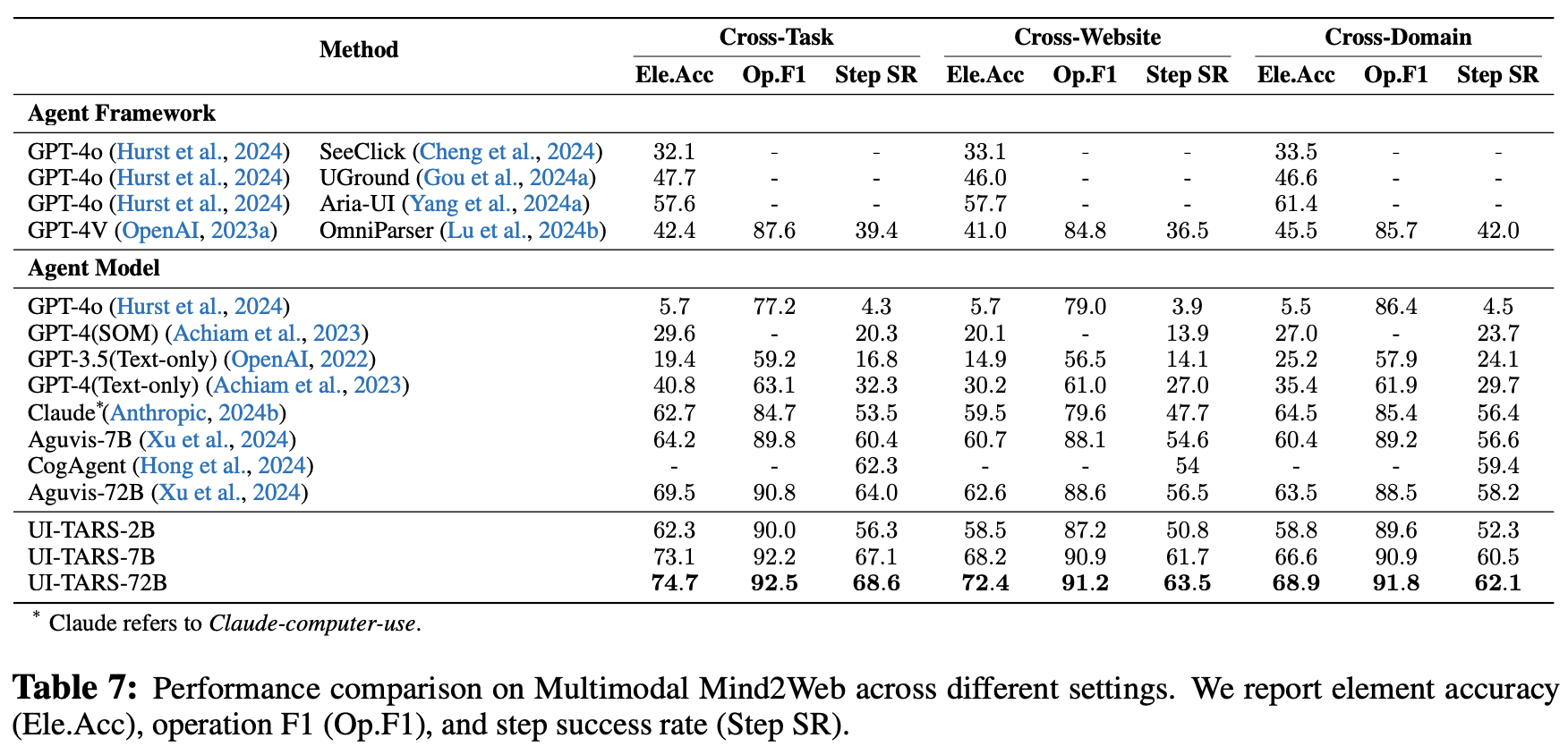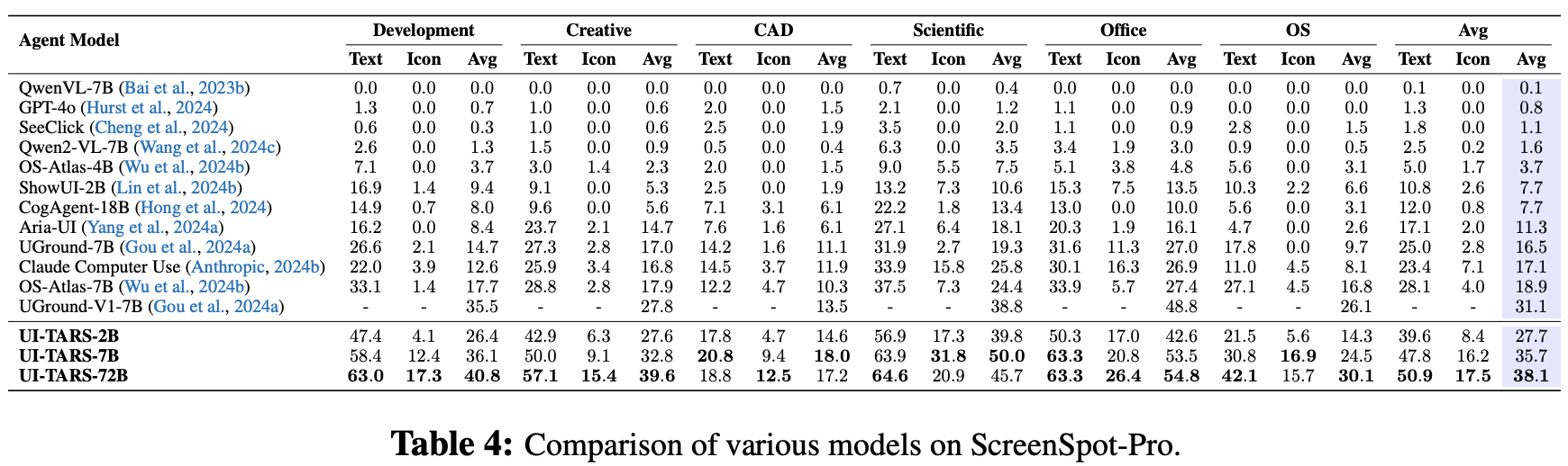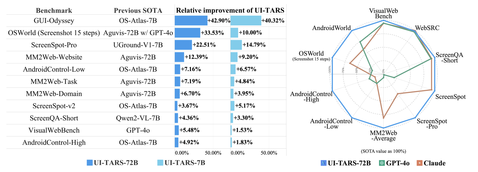 Overall Performance: UI-TARS demonstrates SOTA performance across 10+ GUI Agent benchmarks, covering evaluation for perception, grounding, and agent task execution. These results validate the effectiveness of our method, significantly outperforming competitive baselines such as GPT-4o and Claude Computer Use (Anthropic, 2024b) in reasoning-intensive and dynamic scenarios.