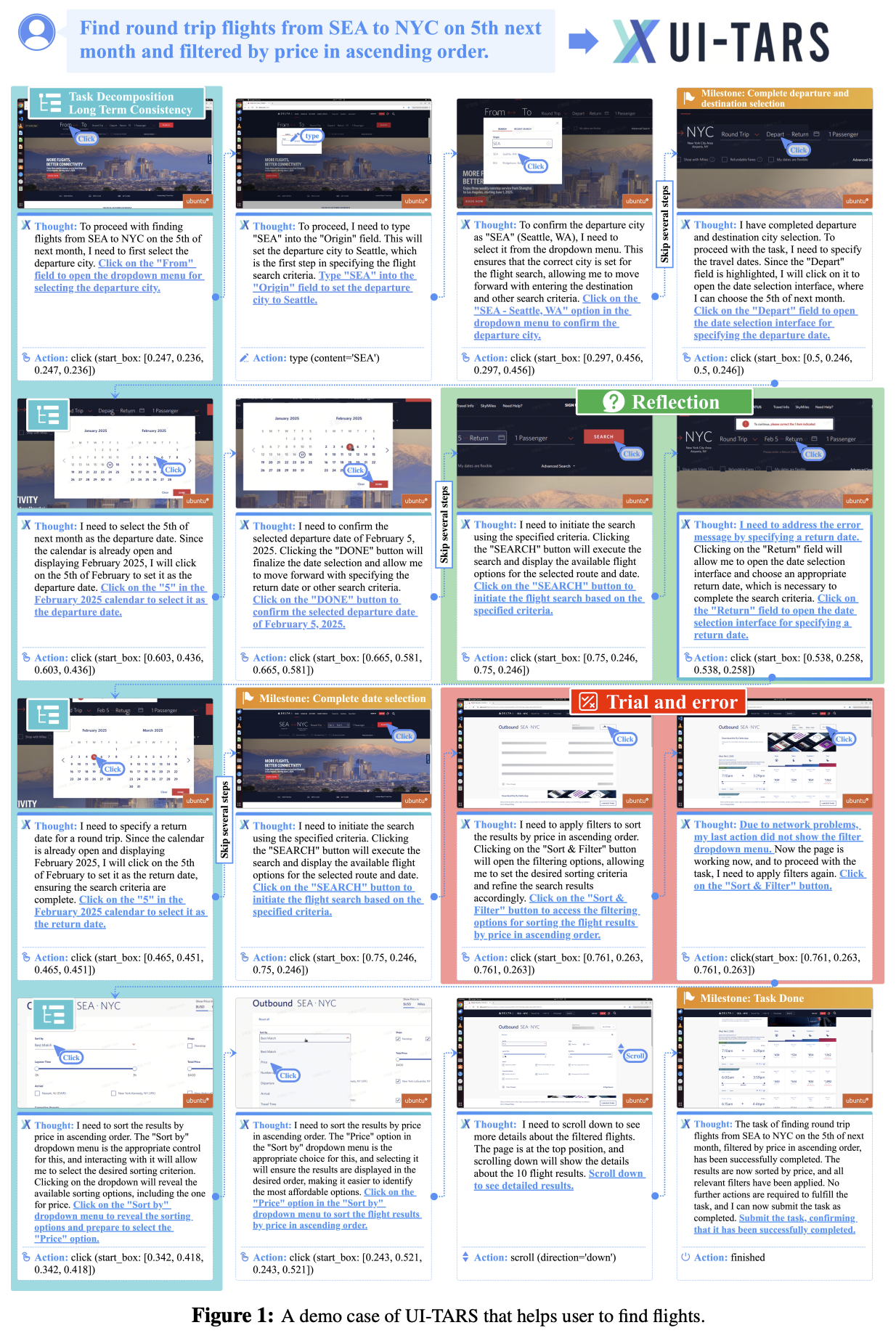 图1:UI-TARS的一个演示案例,帮助用户找到航班。
