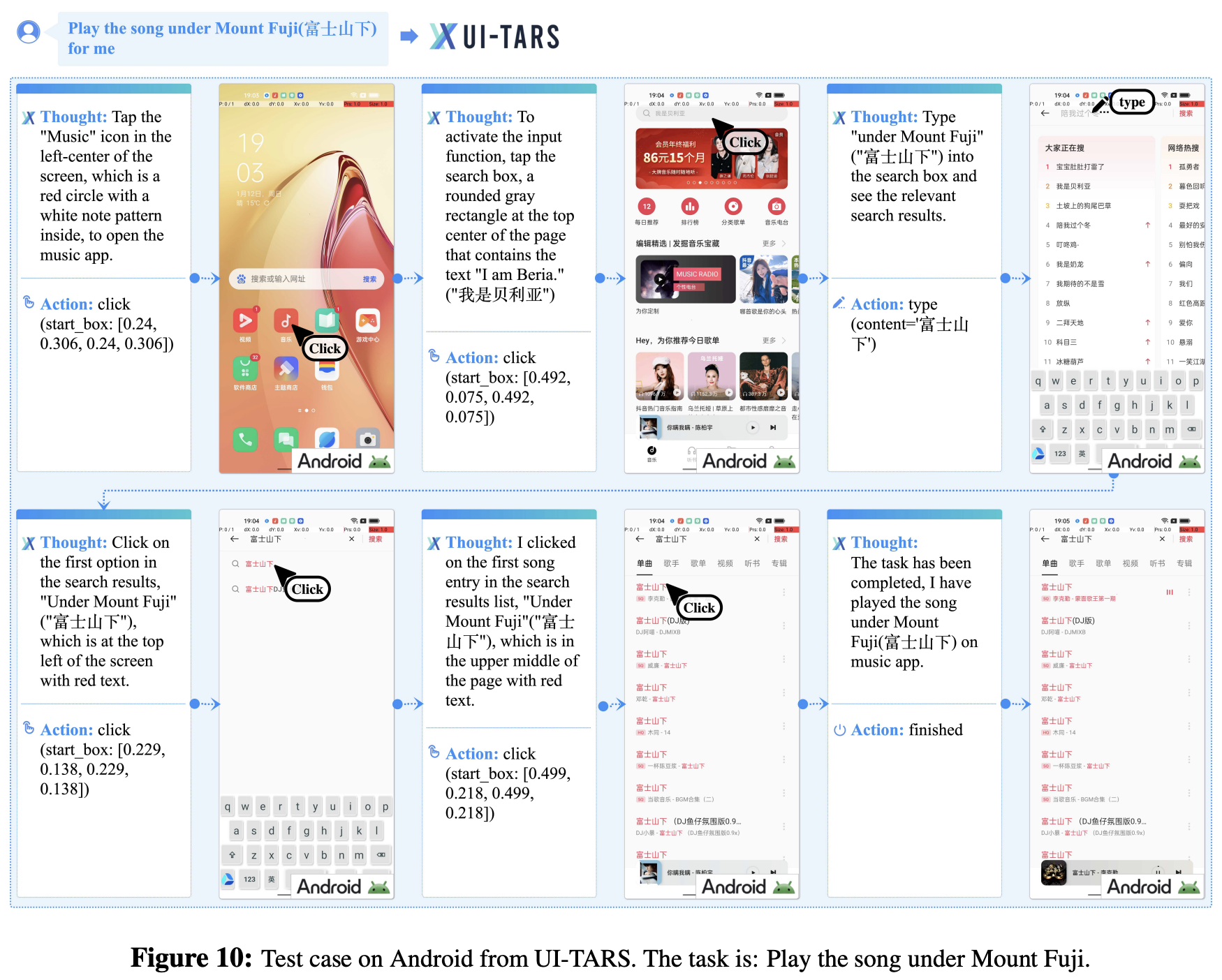 图10:UI-TARS在Android上的测试案例。任务是:播放富士山下的歌曲。