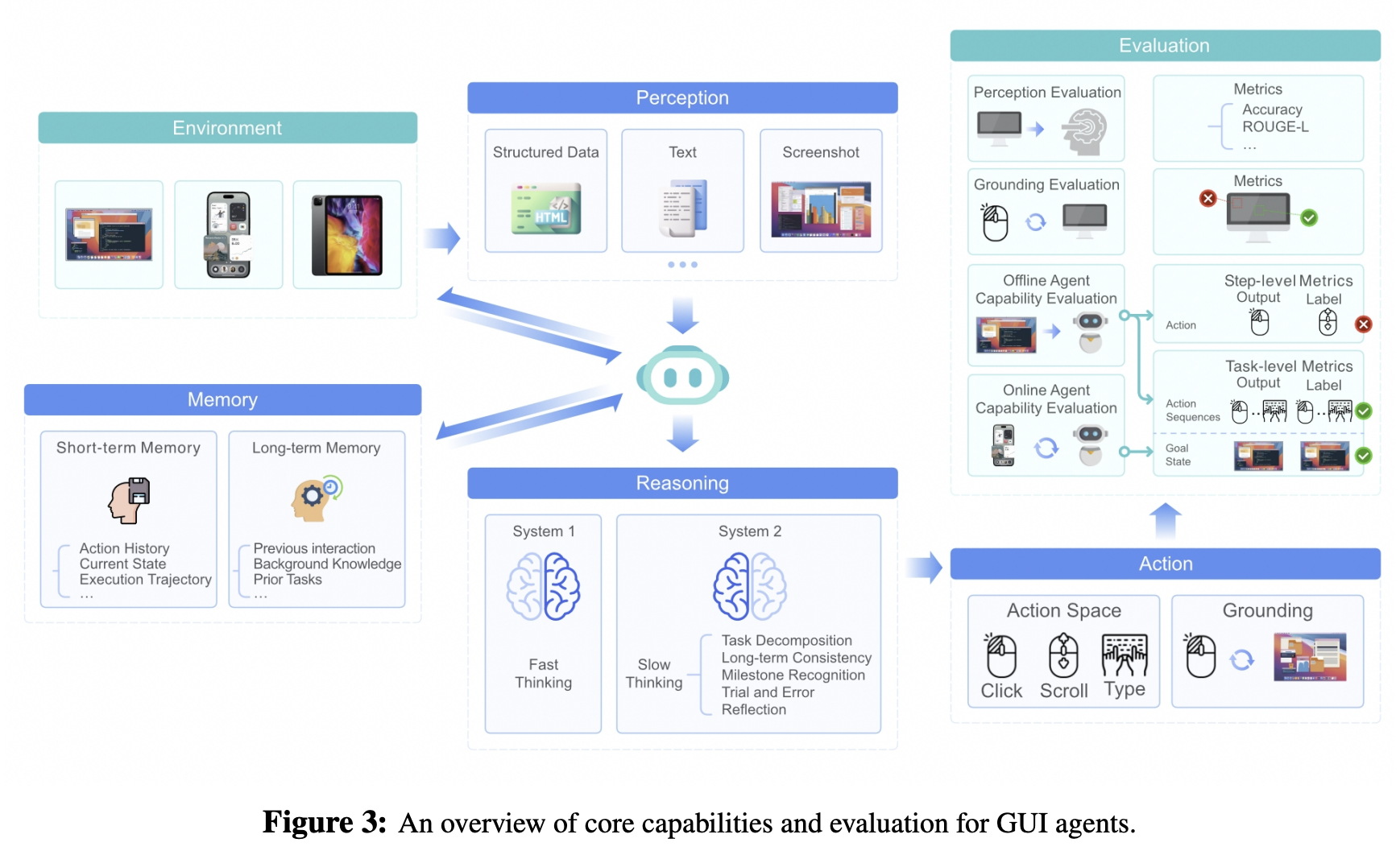 图3:GUI代理的核心能力和评估概述。