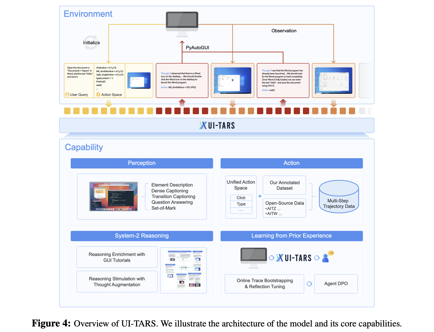 Unified Action Modeling for Multi-step Execution (§ 4.3): we design a unified action space to standardize semantically equivalent actions across platforms. To improve multi-step execution, we create a large-scale dataset of action traces, combining our annotated trajectories and standardized open-source data. The grounding ability, which involves accurately locating and interacting with specific GUI elements, is improved by curating a vast dataset that pairs element descriptions with their spatial coordinates. This data enables UI-TARS to achieve precise and reliable interactions.