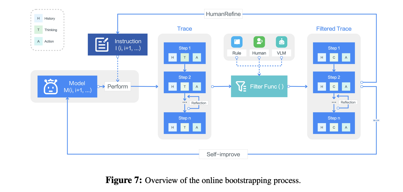 Iterative Refinement by Learning from Prior Experience (§ 4.5): a significant challenge in GUI agent development lies in the scarcity of large-scale, high-quality action traces for training. To overcome this data bottleneck, UI-TARS employs an iterative improvement framework that dynamically collects and refines new interaction traces. Leveraging hundreds of virtual machines, UI-TARS explores diverse real-world tasks based on constructed instructions and generates numerous traces. Rigorous multi-stage filtering—incorporating rule-based heuristics, VLM scoring, and human review—ensures trace quality. These refined traces are then fed back into the model, enabling continuous, iterative enhancement of the agent’s performance across successive cycles of training. Another central component of this online bootstrapping process is reflection tuning, where the agent learns to identify and recover from errors by analyzing its own suboptimal actions. We annotate two types of data for this process: (1) error correction, where annotators pinpoint mistakes in agent-generated traces and label the corrective actions, and (2) post-reflection, where annotators simulate recovery steps, demonstrating how the agent should realign task progress after an error. These two types of data create paired samples, which are used to train the model using Direct Preference Optimization (DPO) (Rafailov et al., 2023). This strategy ensures that the agent not only learns to avoid errors but also adapts dynamically when they occur. Together, these strategies enable UI-TARS to achieve robust, scalable learning with minimal human oversight.