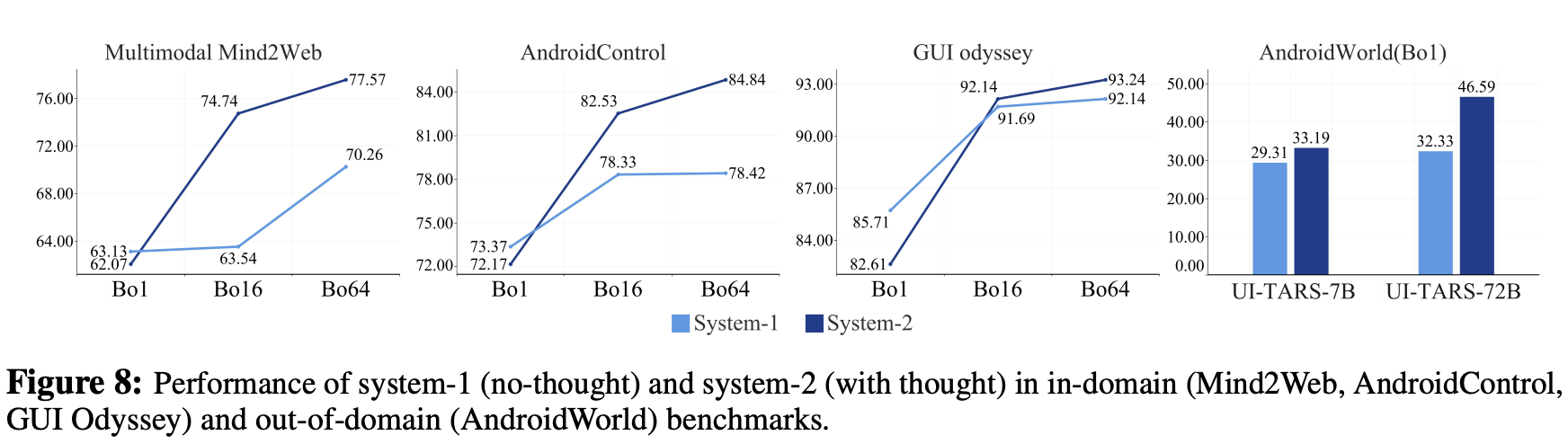Agent Capabilities: extensive evaluations highlight UI-TARS ’s superior agent capabilities. Experiments demonstrate exceptional performance in reasoning-intensive benchmarks, with the 72B variant particularly excelling in multistep and dynamic tasks. Notably, UI-TARS achieves excellent results on challenging benchmarks such as OSWorld (Xie et al., 2024) and AndroidWorld (Rawles et al., 2024a). In OSWorld, UI-TARS-72B achieves scores of 24.6 with 50 steps and 22.7 with 15 steps, outperforming Claude’s 22.0 and 14.9 respectively. In AndroidWorld, it achieves a score of 46.6, outshining GPT-4o’s 34.5, further emphasizing its ability to tackle high-complexity real-world scenarios.