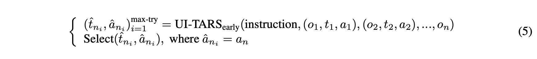 通过从先前经验中学习进行迭代改进 (§ 4.5):GUI代理开发中的一个重要挑战在于缺乏用于训练的大规模、高质量的动作轨迹。为了克服这一数据瓶颈,UI-TARS采用了一个动态收集和改进新交互轨迹的迭代改进框架。利用数百台虚拟机,UI-TARS基于构建的指令探索各种现实世界任务,并生成大量轨迹。严格的多阶段过滤——包括基于规则的启发式、VLM评分和人工审查——确保了轨迹质量。然后将这些经过改进的轨迹反馈到模型中,使代理在连续的训练周期中不断迭代地提高性能。这个在线引导过程的另一个核心组件是反思调优,代理通过分析自己的次优动作来学习识别和纠正错误。我们为这个过程注释了两种类型的数据:(1)