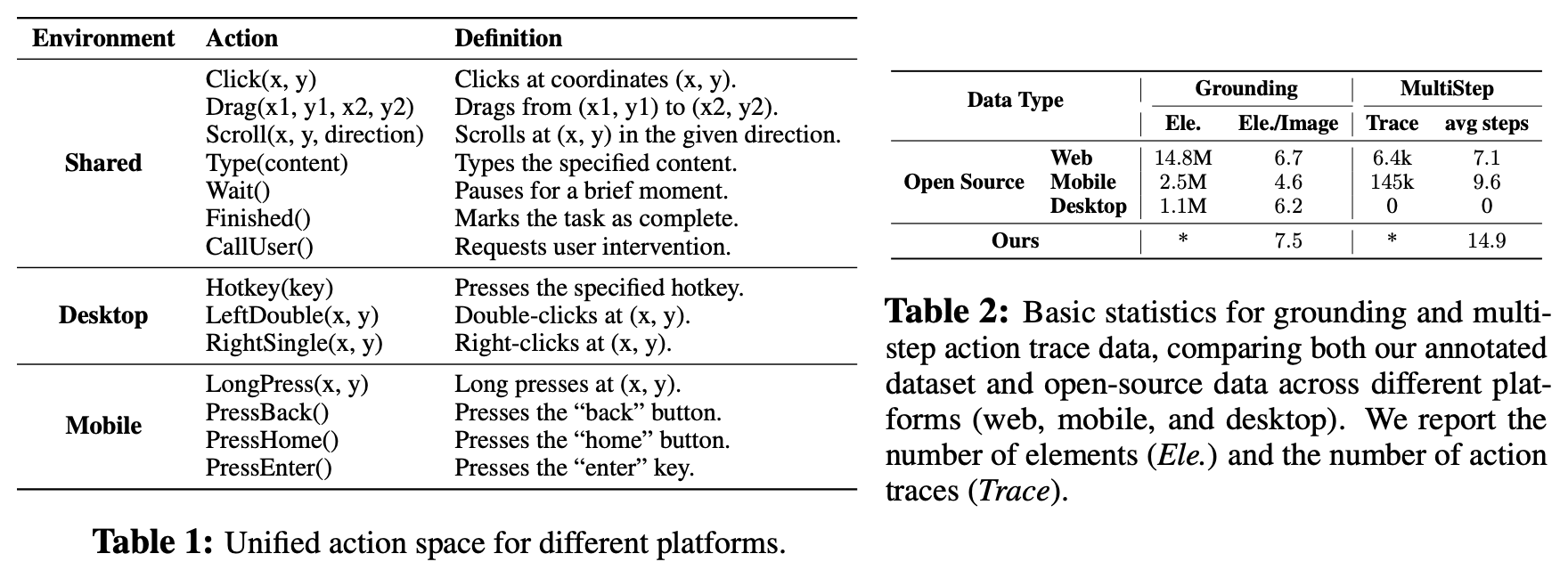 统一动作建模以实现多步执行 (§ 4.3):我们设计了一个统一的动作空间,以标准化跨平台的语义等效动作。为了提高多步执行,我们创建了一个大规模的动作轨迹数据集,结合了我们的注释轨迹和标准化的开源数据。通过整理将元素描述与其空间坐标配对的大量数据集,提高了涉及准确定位和与特定GUI元素交互的基础能力。这些数据使UI-TARS能够实现精确可靠的交互。