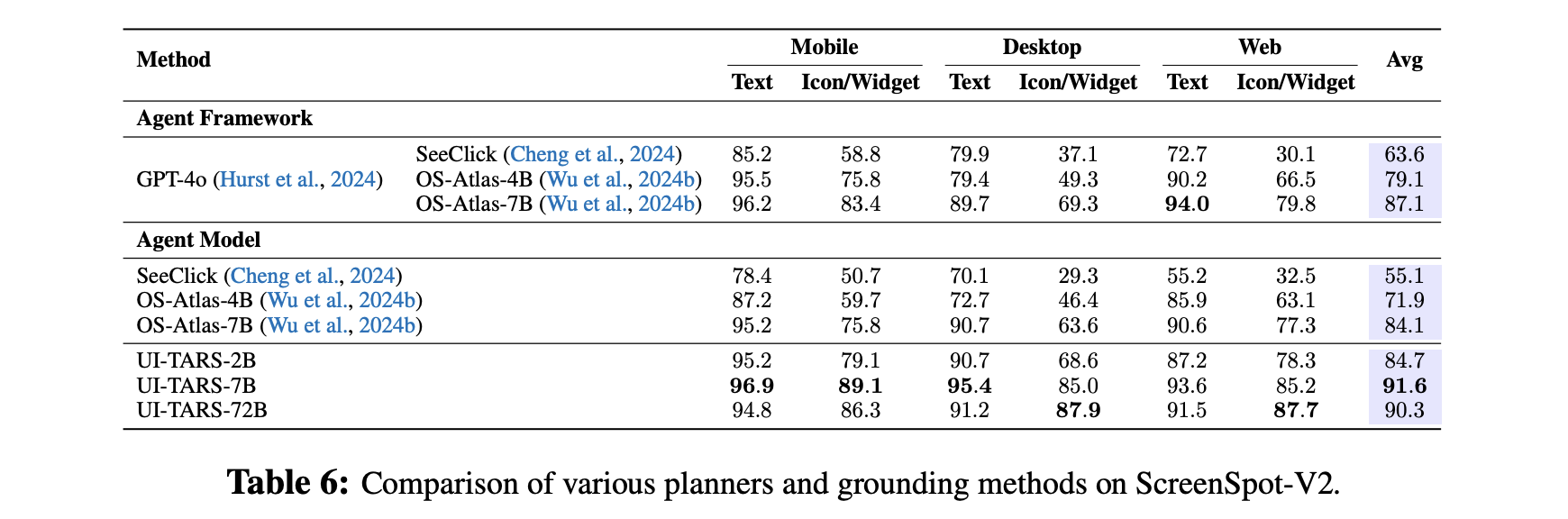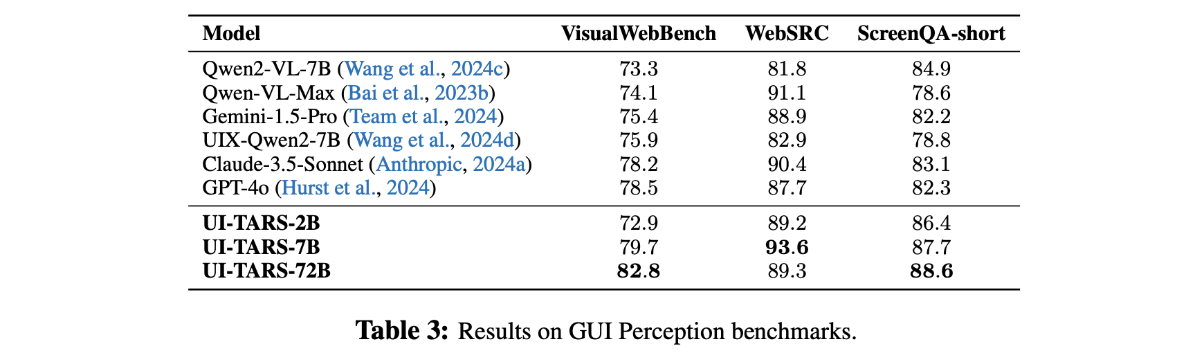 Perception: UI-TARS excels in GUI perception, effectively handling high information density and intricate layouts. Experiments confirm its ability to extract precise metadata, describe GUI elements, and generate detailed, context-aware captions. For example, UI-TARS-72B scored 82.8 in VisualWebBench (Liu et al., 2024c), higher than GPT-4o (78.5).