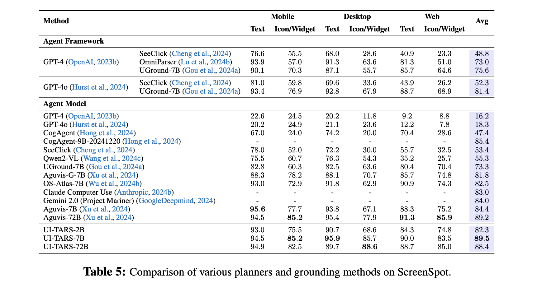 Grounding: UI-TARS achieves high-precision grounding across mobile, desktop, and web environments by accurately associating GUI elements with their spatial coordinates. For example, it scores 38.1 (SOTA) on a recently released challenging benchmark ScreenSpot Pro (Li et al., 2025).