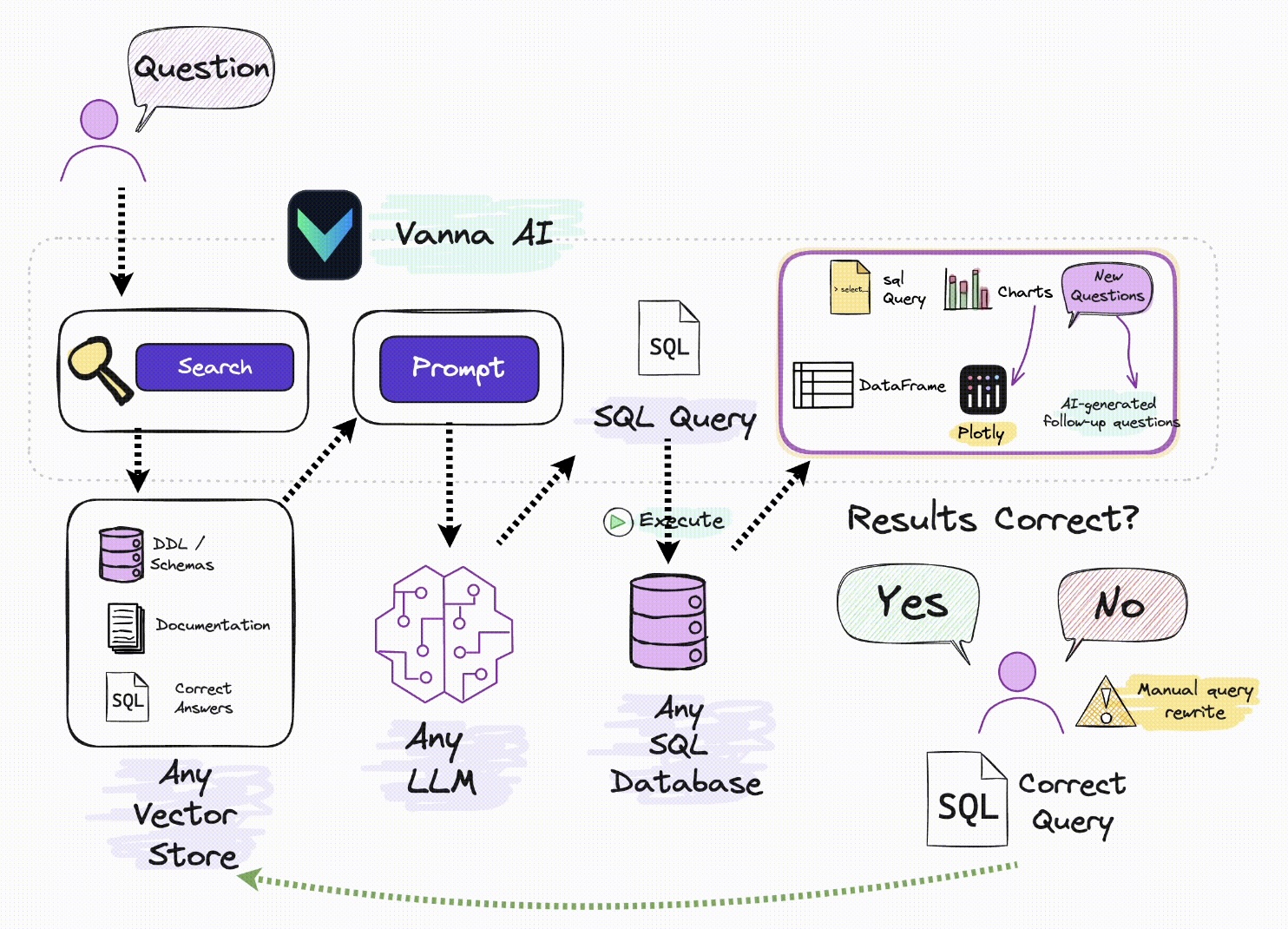 Vanna 的工作过程分为两个简单步骤 - 在您的数据上训练 RAG“模型”,然后提出问题,这些问题将返回 SQL 查询,这些查询可以设置为在您的数据库上自动运行。