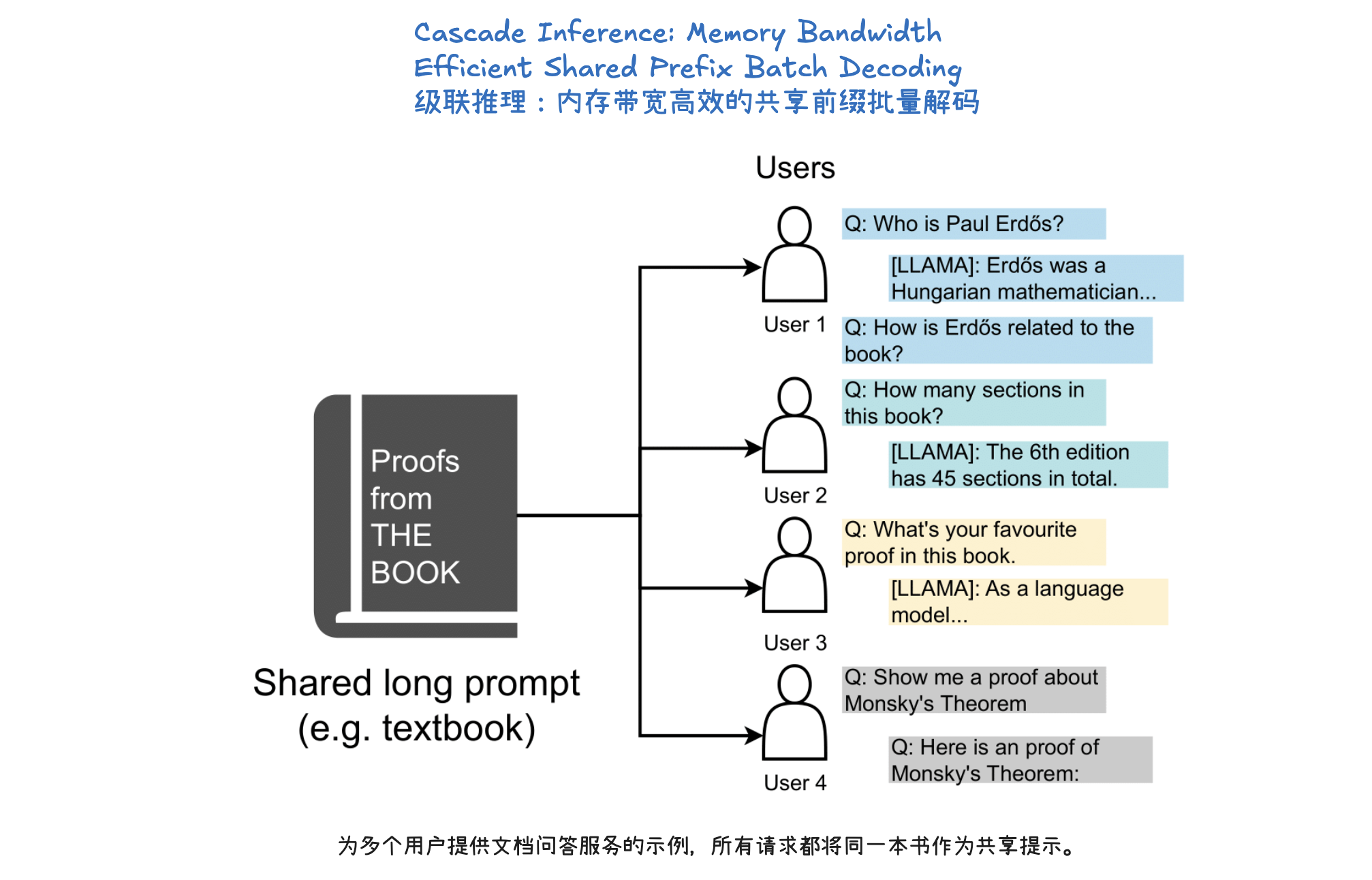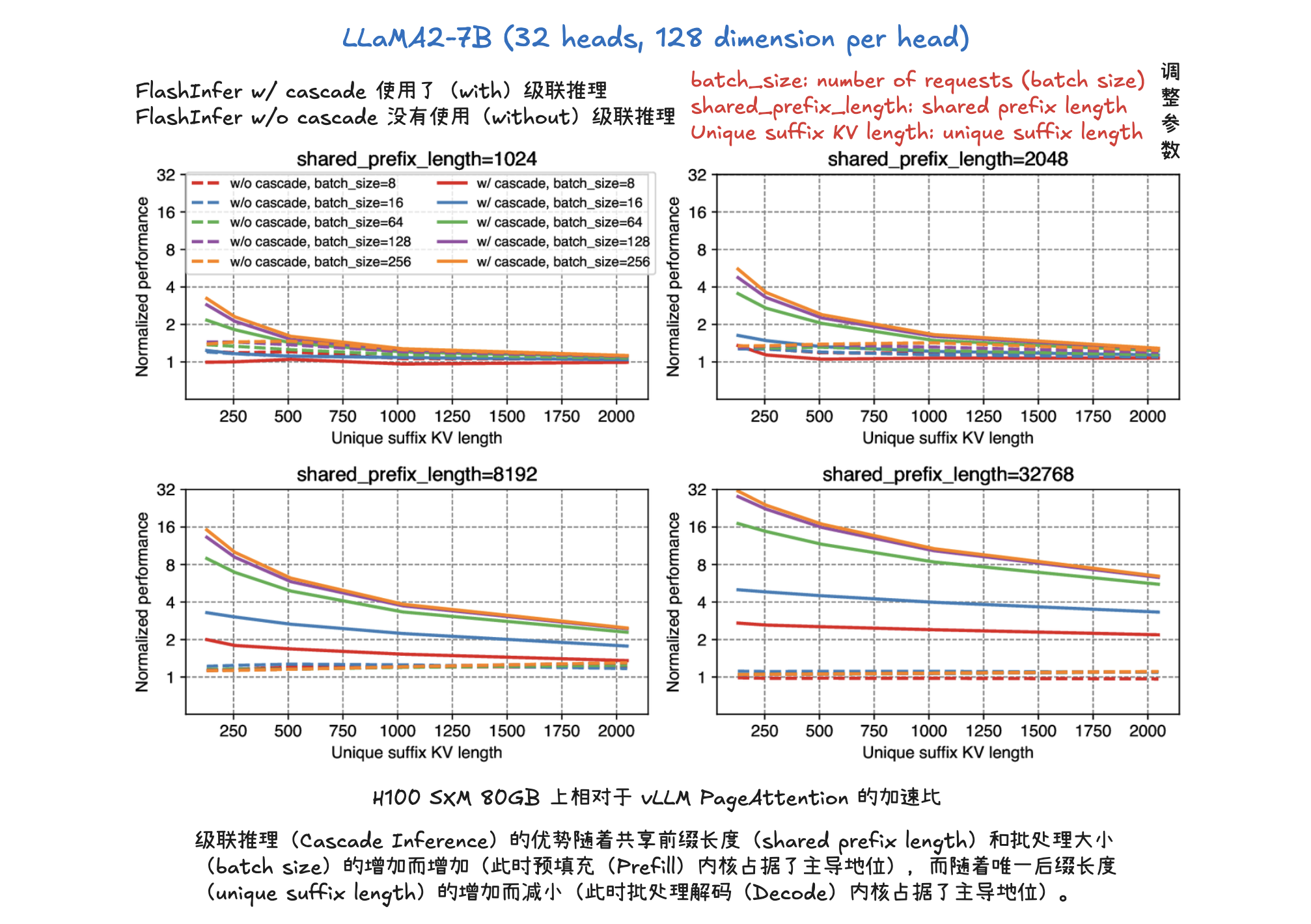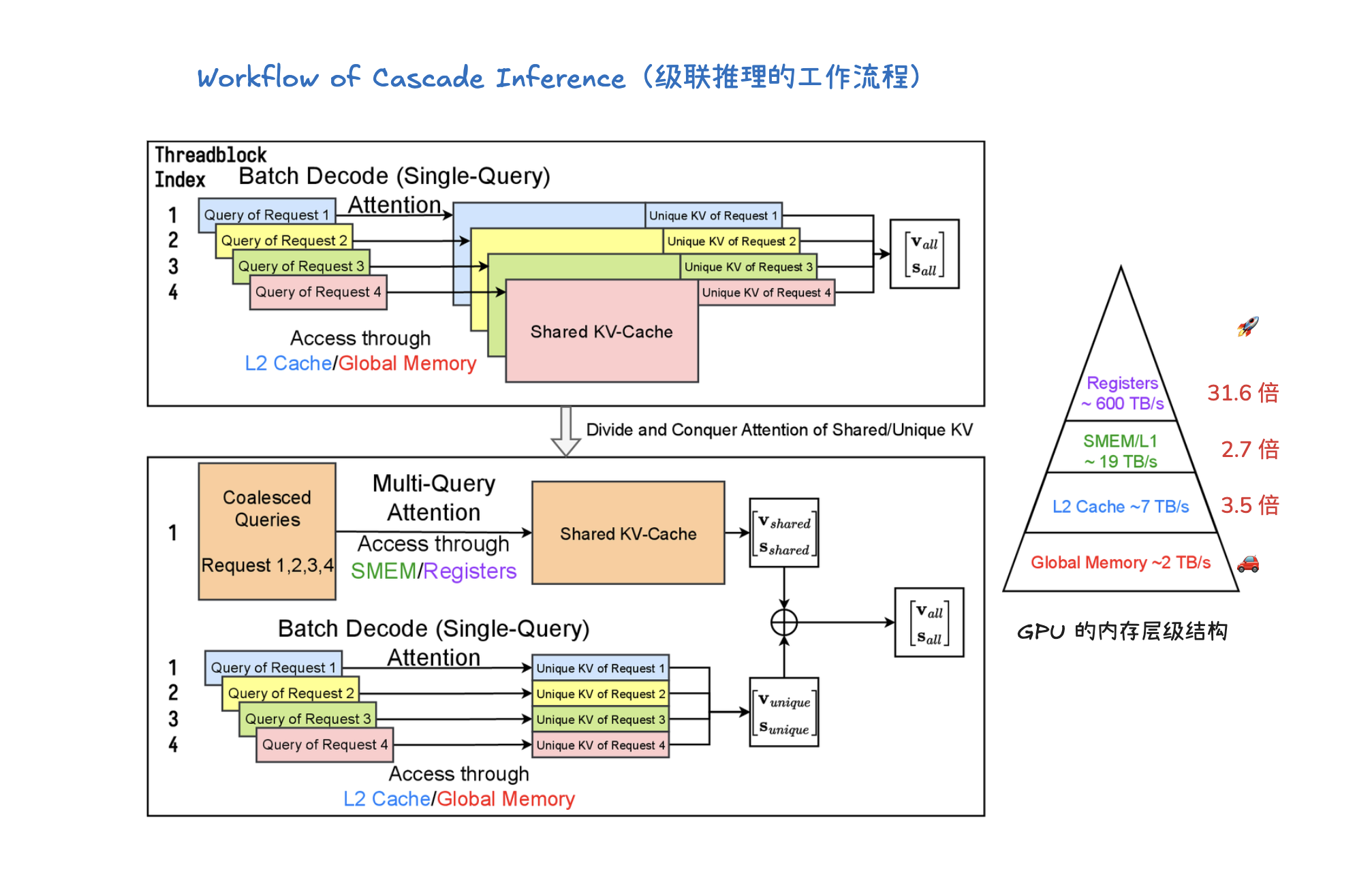 级联推理(Cascade Inference) 是一种旨在大幅提高大型语言模型(LLM)推理效率的技术,尤其针对多个请求共享相同前缀(prompt)的场景,如长文档问答或自洽性生成。它通过将注意力计算解耦为两个阶段来实现:首先,利用多查询注意力内核计算查询与共享前缀的KV-Cache之间的注意力状态,并将其存储在GPU共享内存(SMEM)中以实现快速访问和最大化内存重用;其次,使用批处理解码注意力内核计算查询与独特后缀的KV-Cache之间的注意力状态。最后,通过一个具有结合律和交换律的“合并操作符”(merge operator),将这两部分的注意力状态数学上等价地组合起来,得到最终的注意力输出。这种“分而治之”的方法显著提升了内存带宽效率,例如在H100 SXM 80GB上可实现高达31倍的加速。