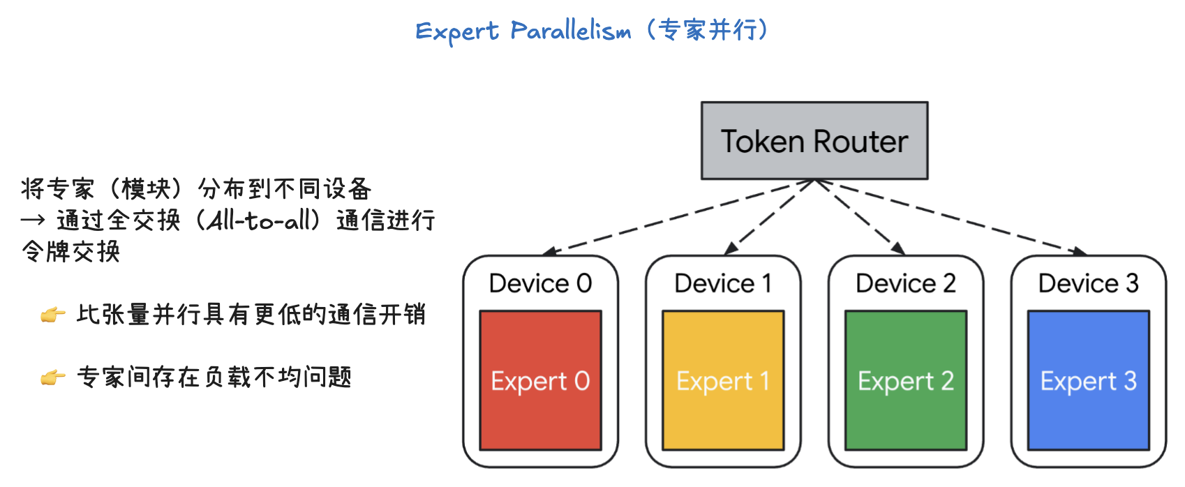 - 专家(Expert 0, 1, 2, 3)被分别部署在不同的设备上(Device 0, 1, 2, 3)。