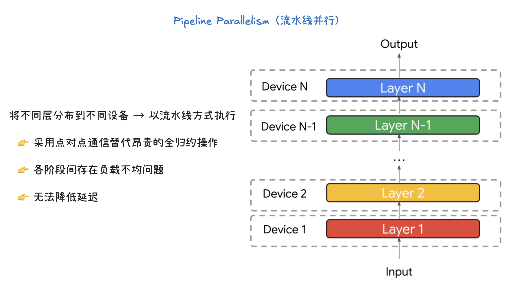 - 通信方式: 这种并行方式采用点对点通信(Point-to-point communication),而不是像张量并行那样昂贵的 All-reduce 操作。这意味着每个设备只需要与下一个设备进行通信,大大减少了整体的通信开销。