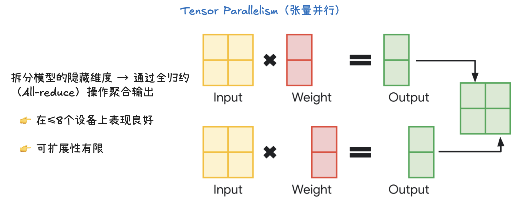 - 局限性: 张量并行的可扩展性有限。当使用的设备数量增多时,All-reduce 操作的通信开销会迅速增加,导致效率下降,因此不适合用于大规模的设备集群。
