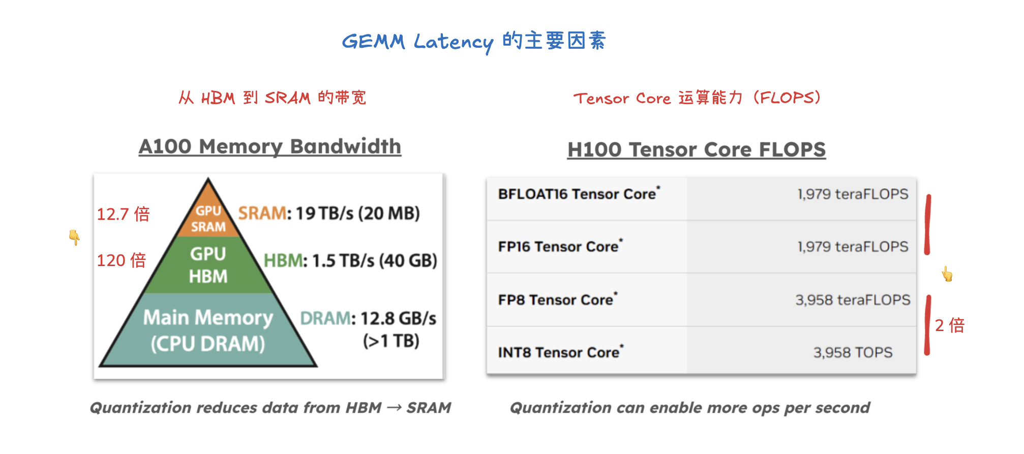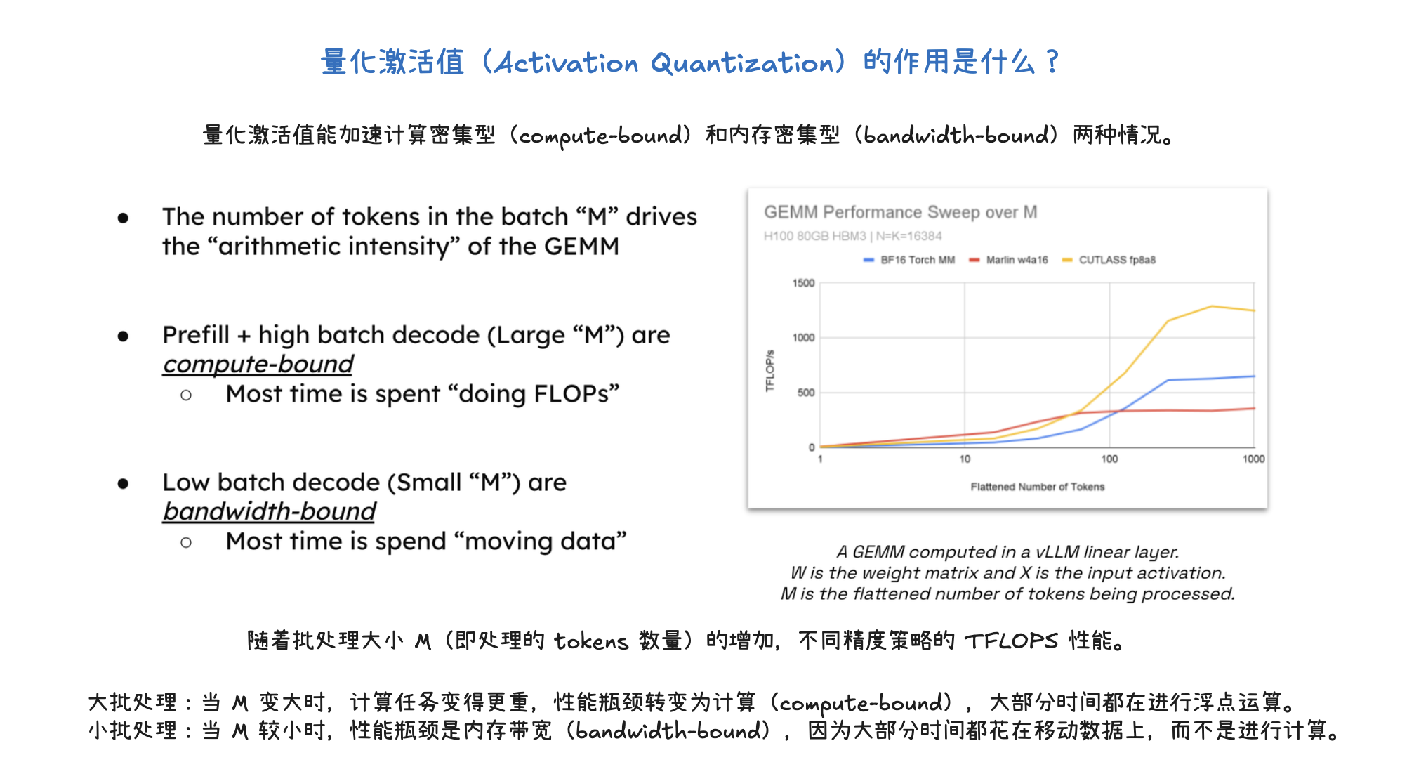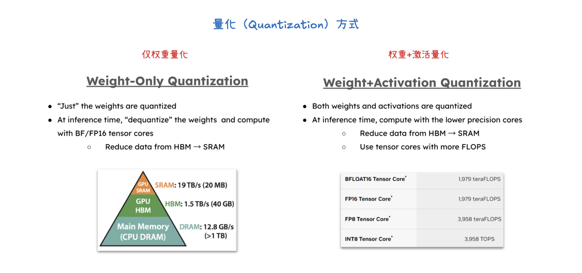 量化(Quantization)是一种通过使用低位精度(如 FP8、INT8、FP4)来存储和计算大型语言模型参数和激活值的方法。其主要目标是降低存储和内存占用,例如将 100B 模型从 BFloadt16 的 200GB 减少到 FP8 的 100GB。量化通过减少 HBM 到 SRAM 的数据传输,并利用具有更高 FLOPS 的 Tensor Core,显著加速计算密集型(预填充和大批处理解码)和内存带宽密集型(小批处理解码)两种情况。具体方法包括仅权重量子化(只量化权重)和权重+激活量子化(同时量化权重和激活值),以及对 KV 缓存进行量化以减少存储空间并加速注意力机制,这对长上下文工作负载尤为关键。最终,量化能够在固定硬件下处理更多 token,从而大幅提升吞吐量,同时通过实验验证,量化后的模型仍能保持良好的准确性和稳定性。