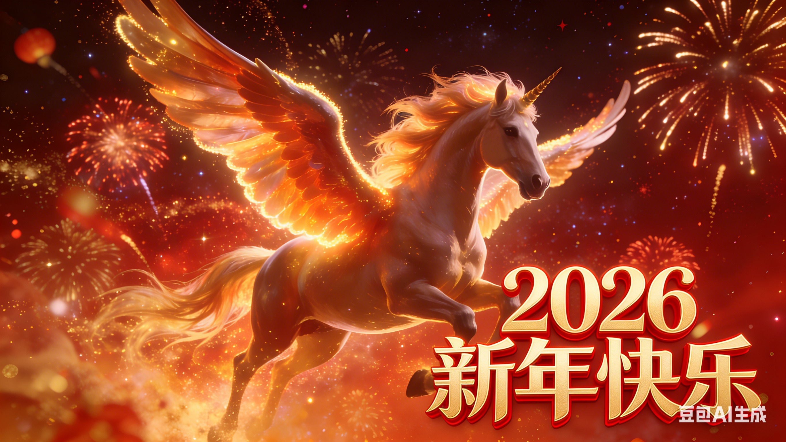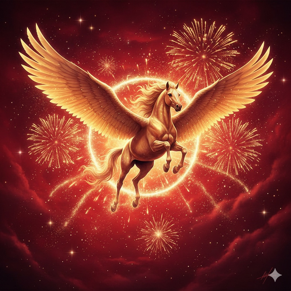 2026年新年来了,生成一张红色的飞马图像。以这个为基础写个生成图像的提示词