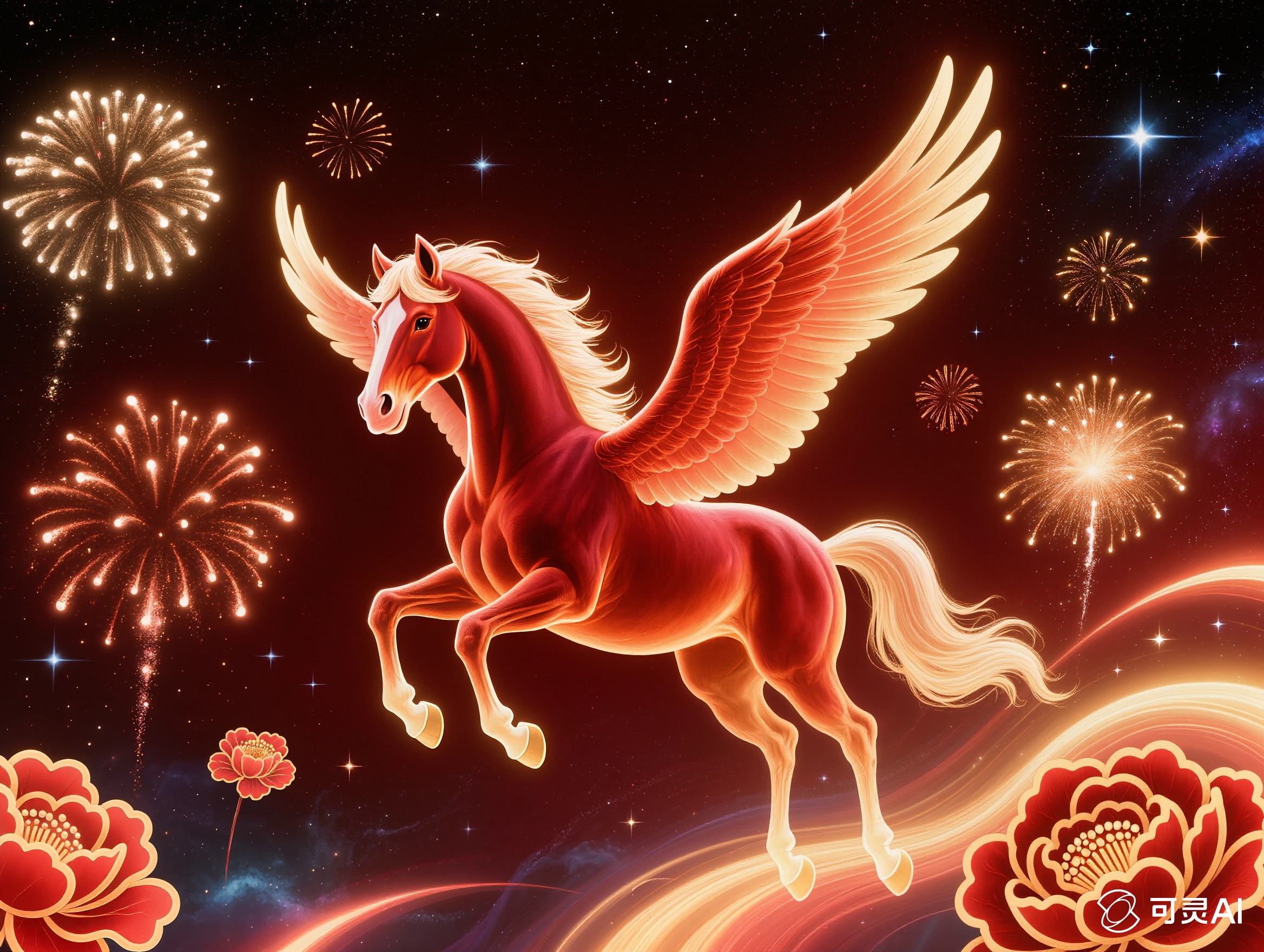 一只雄伟的飞马(天马)在绚烂的夜空中展翅翱翔,周围环绕着金色与橙红色的新年烟火,鬃毛与翅膀边缘散发柔和光芒,背景为深红色星空与闪烁的星光,风格融合奇幻艺术与节日喜庆,色彩以红色、金色为主,充满动态与希望感,4K高清,细节精致,史诗光影。