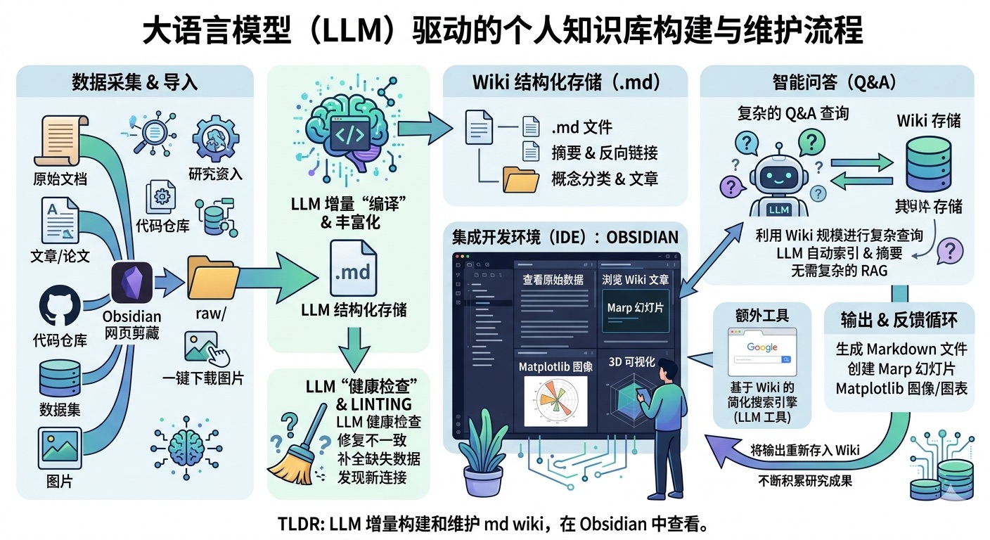 从多个来源收集原始数据,由大语言模型编译为 Markdown 格式知识库;再通过各类命令行工具驱动大语言模型完成问答,并逐步完善知识库,所有内容均可在 Obsidian 中查看。几乎无需手动编写或编辑知识库,全程由大语言模型主导维护。我认为这一方向完全有潜力诞生一款出色的新产品,而非目前这种零散脚本的组合方案。
