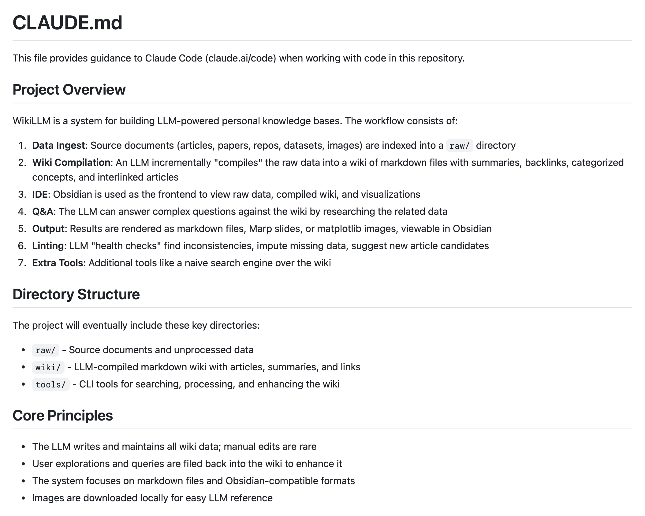 - IDE:Obsidian 用作前端查看原始数据、编译后的 wiki 和可视化